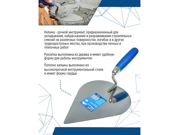 Полотно кельмы выполнено из высокопрочной инструментальной стали и имеет форму сердца.