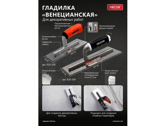 Увеличенный размер гладилки для быстрого нанесения на большие площади. Для создания декоративных текстур, плавных переходов. Заточенные кромки лезвия - исключают появление царапин и борозд.