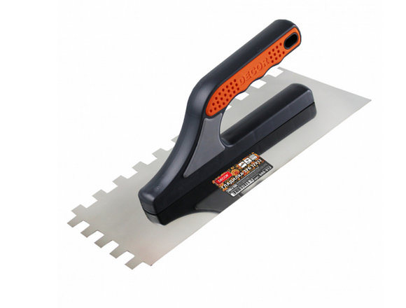 Гладилка для нанесения и распределения клея для плитки, кафеля и керамогранитаУдобная прорезиненная ручка облегчает работу с растворомПолотно из нержавеющей полированной стали с зубьями 12х12ммДля плитки ≤ 20х20 см
