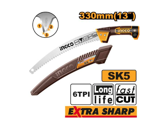 Ножовка садовая INGCO 330мм, SK5, 7TPI, изогнутое лезвие, КРЕПЛЕНИЕ на штангу ,ЧЕХОЛ (6/48)