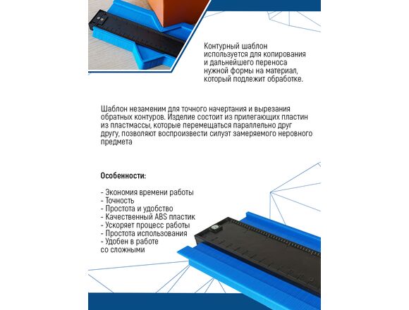 Шаблон предназначен для измерения очертаний рабочих поверхностей. Идеально подойдет для подгонки ламината, например, при наличии труб отопления. Для удобства работы шаблон оснащен зажимом для фиксации щупа, что исключает смещения контура. Выполнен из прочного пластика.