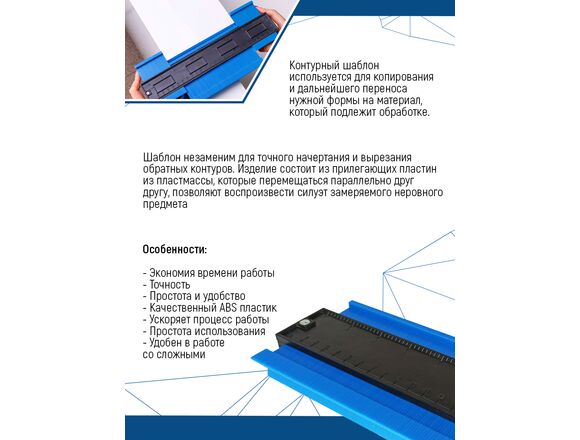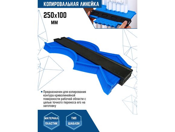 Шаблон предназначен для измерения очертаний рабочих поверхностей. Идеально подойдет для подгонки ламината, например, при наличии труб отопления. Для удобства работы шаблон оснащен зажимом для фиксации щупа, что исключает смещения контура. Выполнен из прочного пластика.