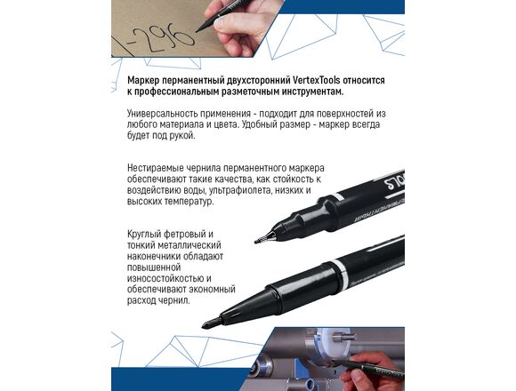 Строительный маркер vertextools черный, двухсторонний 00010-01 предназначен для нанесения информации на всевозможных поверхностях: металл, дерево, керамика, бумага.