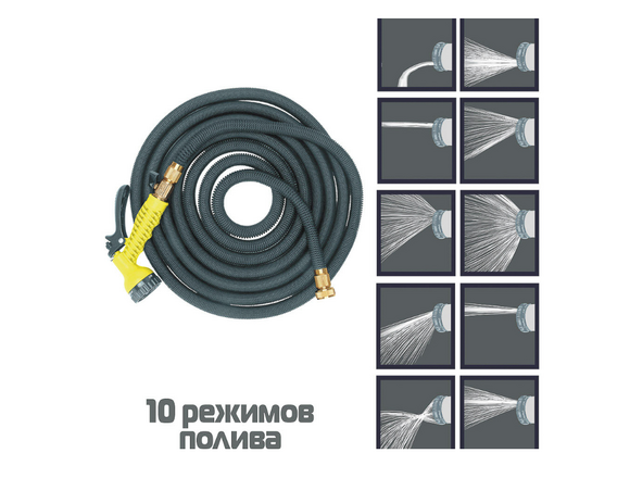 Шланг для полива растягивающийся INBLOOM 5-15м, ЛАТУНЬ / ЛАТЕКС / ПОЛИЭСТР, пистолет 10реж (1/12)