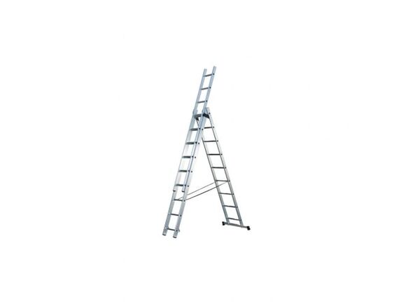 Модель AL 309 можно использовать как трехсекционную лестницу, стремянку и приставную лестницу высотой 2,53 м. Регулировать длину просто – секция крепится на необходимую высоту с шагом в ступень с помощью зацепов с предохранителями. За счет легкости алюминия вес лестницы составляет 10,8 кг – к рабочему месту на небольшое расстояние ее может перенести один человек.