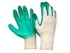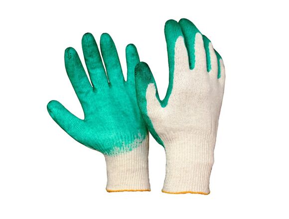 Перчатки трикотажные из натурального хлопка с зеленым одинарным латексным покрытием ладони. Обладают высокой прочностью, предназначены для защиты от механических повреждений острыми углами, порезов арматурой, стеклом, не промокают при работе с влажными материалами.