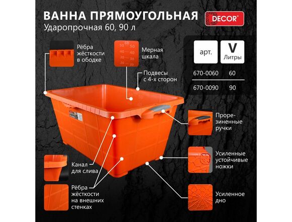 Таз строительный прямоугольный DECOR PROFI 90л ОРАНЖ, ударопрочный морозостойкий, ручки 2К (1/5)