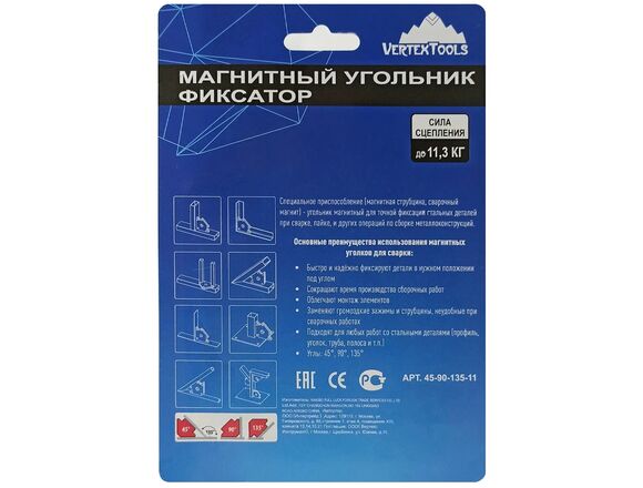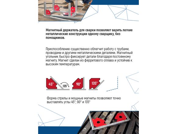 Магнитный держатель для сварки позволяет варить легкие металлические конструкции одному сварщику, без помощников.Приспособление существенно облегчит работу с трубами, проводами и другими металлическими деталями. Магнитный угольник быстро фиксирует детали благодаря постоянному магниту. Магнит сделан из ферритового сплава и устройств в высоким температурам. Форма стрелы и мощные магниты позволяют точно выставлять 45, 90 и 135 градусов.