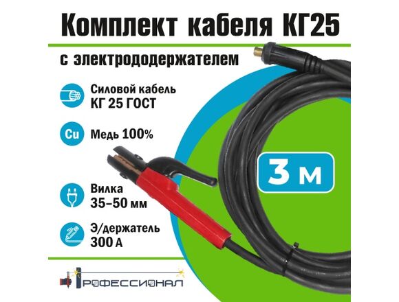 Комплект кабель ПРОФЕССИОНАЛ КГ 25 с электрододержателем 3м вилка 35-50